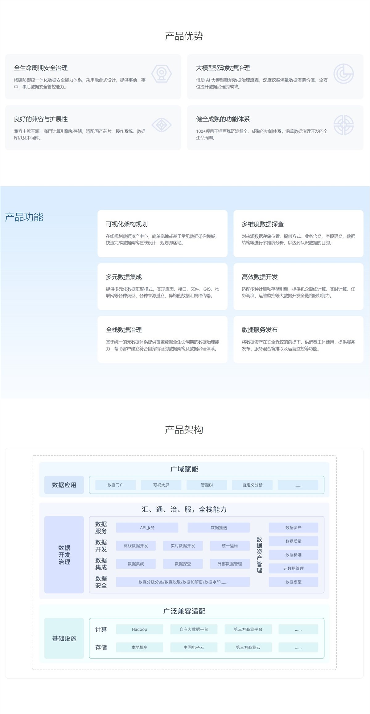 一站式数据开发、治理与服务平台,满足数据开发与管理人员从数据集成、标准、建模、开发、标签、资产、服务各层次应用需求,引入 AI 大模型,为数据治理注入智能驱动力,增强数据治理能力、挖掘数据潜在价值。