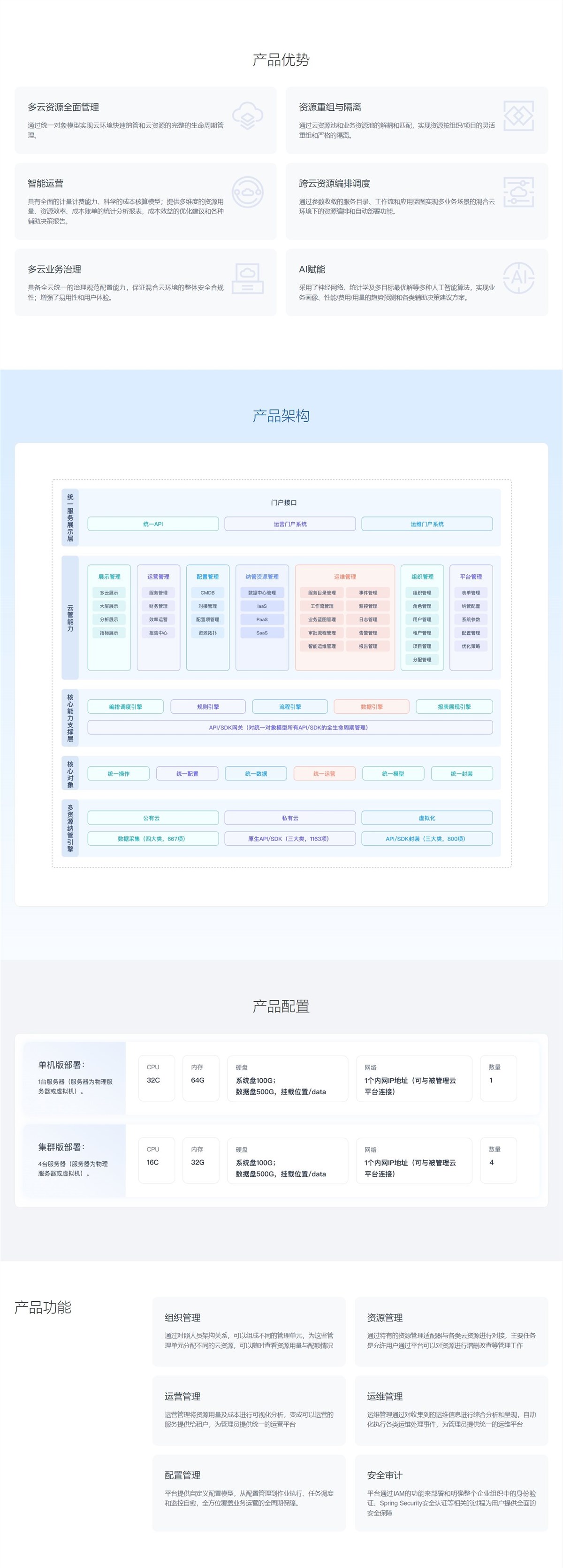 多云管理平台(CloudManager)站在整个企业全局高度,管理企业多云/混合云资源,打通信息孤岛、互联互通从而做到统一门户,统一服务,统一管理。