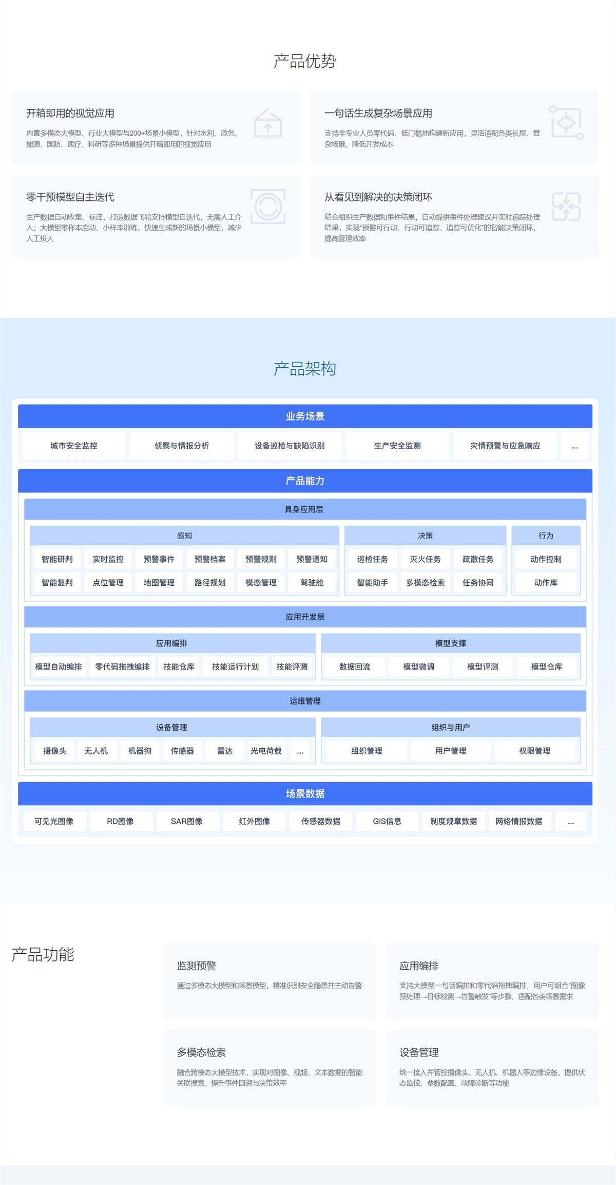 基于多模态大模型的AI视觉应用,聚焦于政务、水利、国防、能源、医疗、科研等重点垂直行业,通过多模态大模型技术,打造软硬一体、开箱即用的多模态视觉综合应用,助力企业实现“预警可行动、行动可追踪、追踪可优化”的智能决策闭环,提高管理效率。